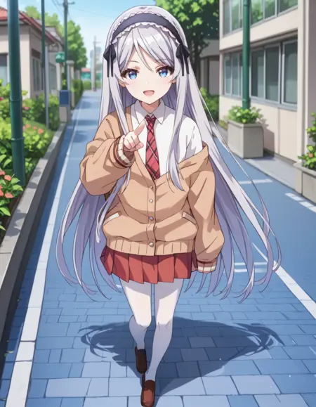 校服,棕色开衫,露肩,白色衬衫,格子领带,长袖,袖子超过手指,红色百褶裙,白色连裤袜,棕色便鞋
