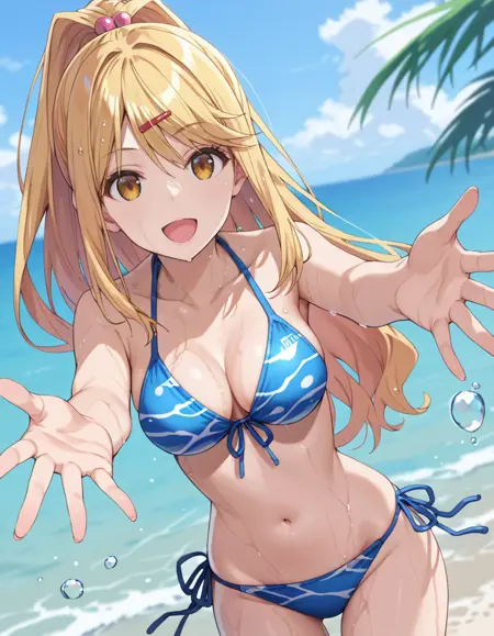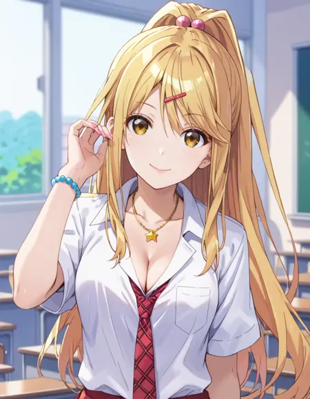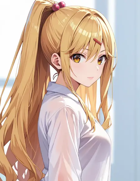<lora:himari_ishikura-kurakon_s1-ixl-anime-soralz:1>, himari ishikura (kurakon), 金发, 长发, 发饰, 马尾辫, 侧分刘海, 头发遮住眼睛, 红色发夹, 侧发, 黄色眼睛