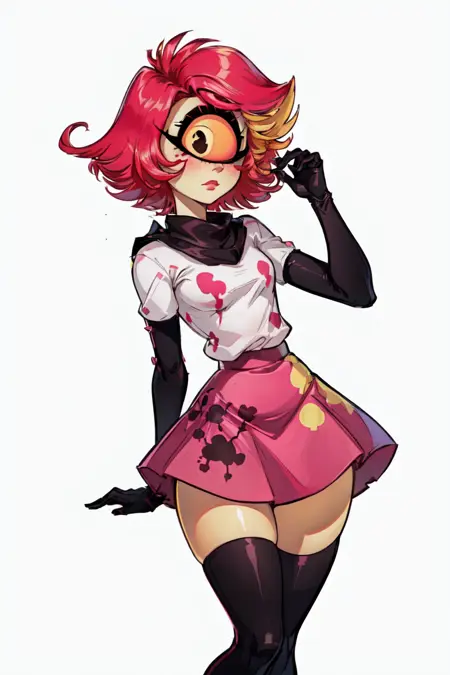 パイロット服: (CasualOutfit), (白シャツ、ピンクのプードルスカート、黒手袋、黒タイツ)