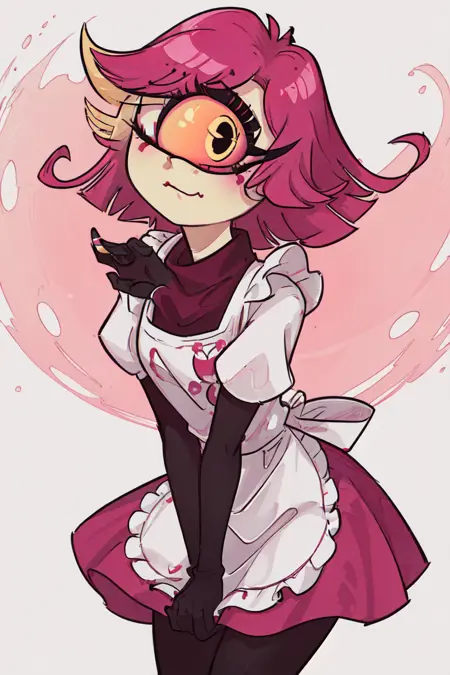 メイド服: (MaidOutfit), (ドレス、ピンクのふわふわ袖、メイド服、エプロン、黒手袋、黒タイツ)