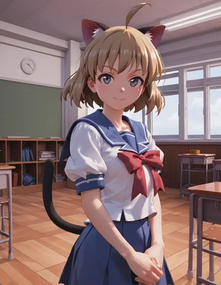 mikotokumano, 灰色の目, 金髪, 短い髪, 猫の耳, 猫の尾, アホ毛, 学校制服, serafuku, スカート, 尾,