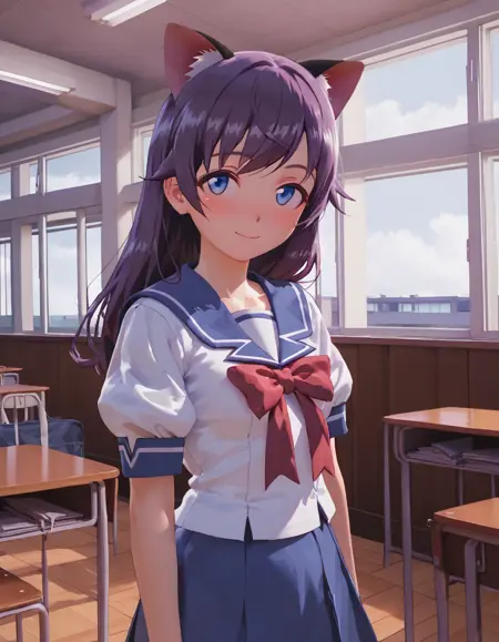 sangonamiki, 紫色の目, 紫色の髪, 短い髪, 前髪, 猫の耳, ヘアバンド, ほっぺたの赤み, 学校制服, serafuku,