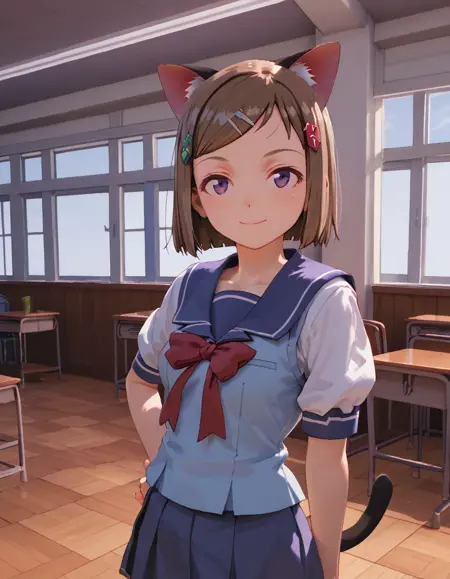 midorihanba, 紫色の目, 茶色の髪, 短い髪, 猫の耳, 猫の尾, 髪飾り, ヘアクリップ, 学校制服, スカート, パンティーホース,