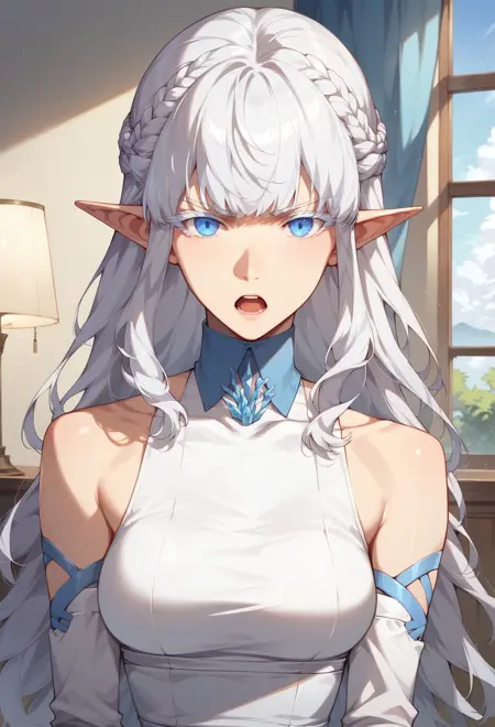 QuikantelV1, white hair, white eyelashes, colored eyelashes, blue eyes, ice grey eyes, long hair, french braid, pointy ears, (sidelocks:1.1), bangs,