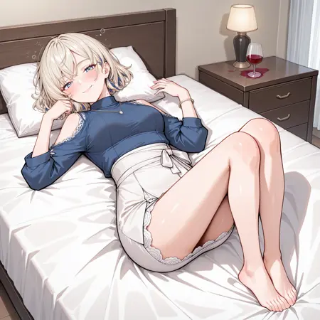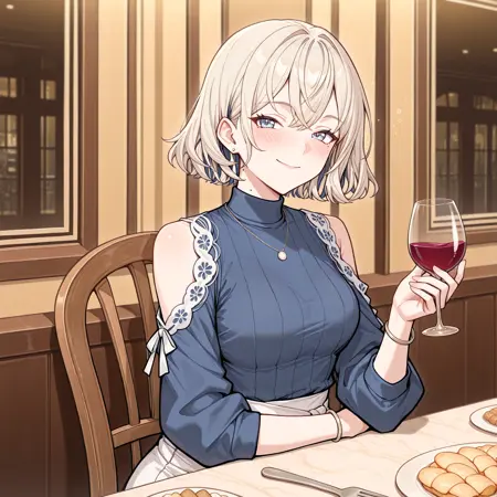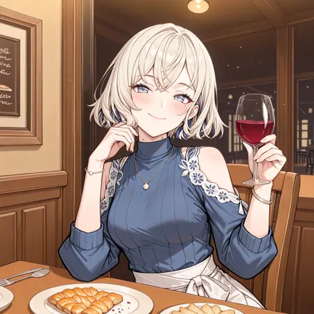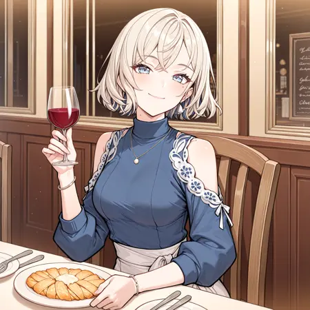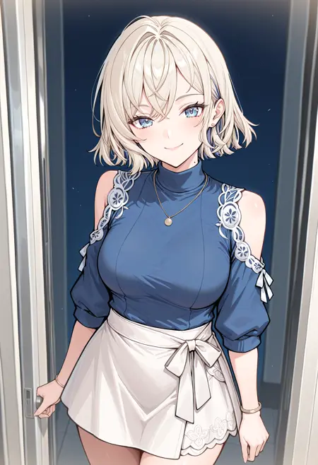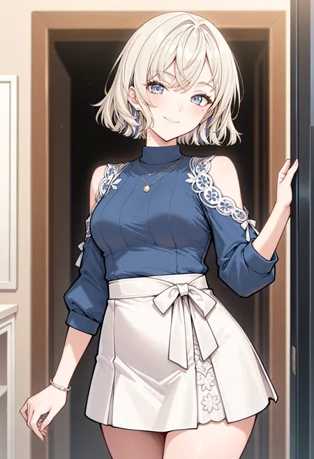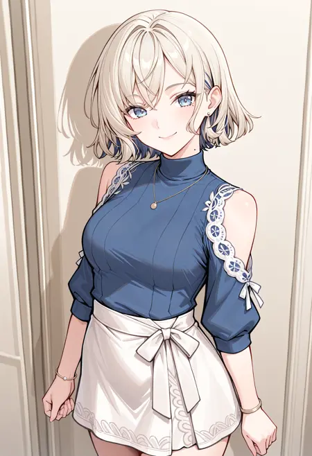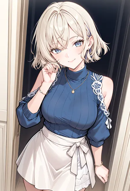gloirerlaw, 白いスカート、青いタートルネックセーター、首のほくろと笑顔、ブレスレット、ネックレス、肩の切り替え部分に白いレースのトリム、