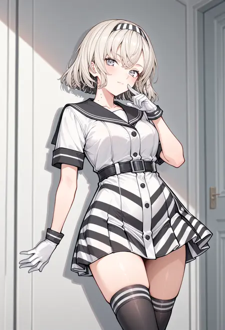 gloirerkai, 黒い縞模様が施された白い海軍服、首のほくろ、手袋、縞模様のヘアバンド、黒い丈長靴下、短い袖、(黒い海軍襟、縞模様のスカートにダズルペイントのスカート:1.4)、