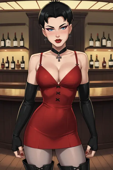 데이트 나이트: 목걸이, 가슴 노출, 어깨 노출, 짧은 드레스, 빨간 드레스, 정장, 빨간 팔꿈치 장갑, 회색 스타킹, 허벅지 길이 스타킹, 허벅지 부츠, 하이힐