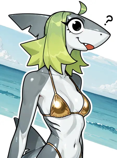 트리거: 로지, 앤트로, 상어, 슬림, 검은 눈, 둥근 눈, 녹색 머리, 회색 몸, 흰색 몸, 이톤 몸, 속눈썹, 귀여운 이빨, 귀 없음, 지느러미, 검은 비키니