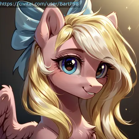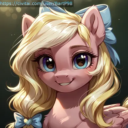 bay_breeze, pegasus, gradient eyes, pink body, yellow hair, blue hair bow