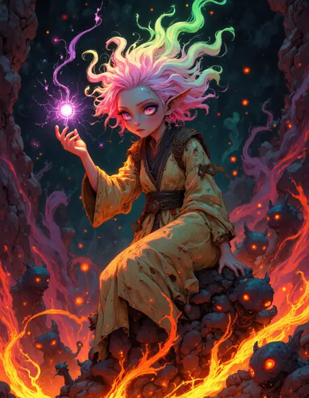 마법적 요소 – 빛나는 구체, 떠다니는 형체, 정교한 액세서리로 마법 같은 분위기를 강화합니다.