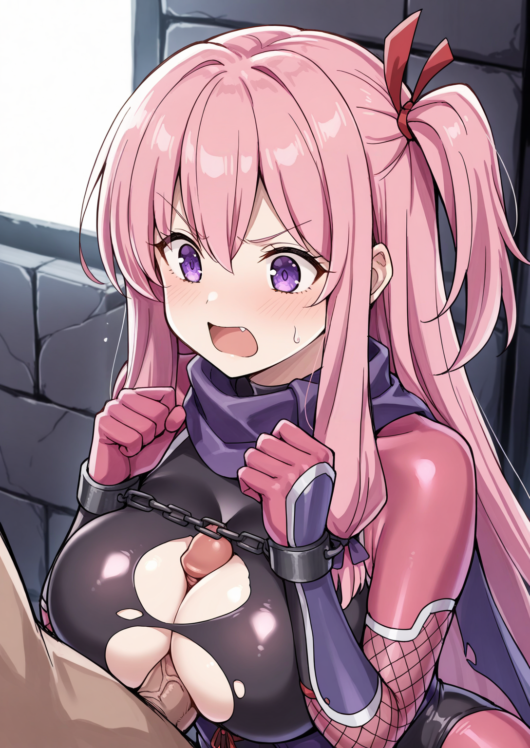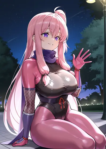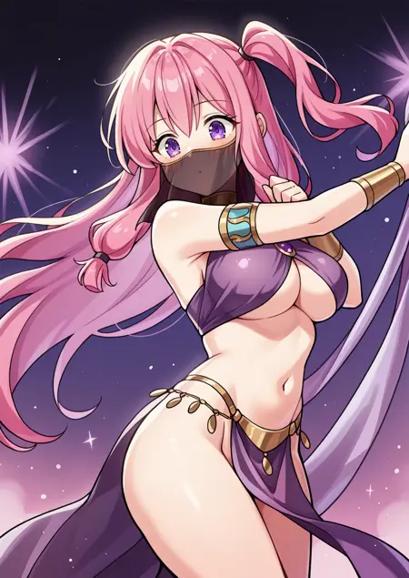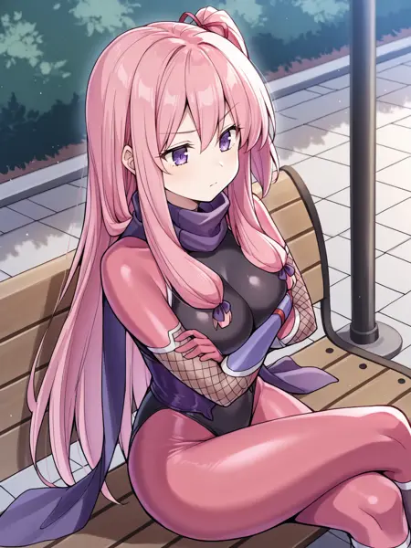 服装:黒のレオタード、ピンクのボディーストッキング、紫のコルセット、赤いリボン、フィッシュネット、紫のスカーフ、紫の手袋