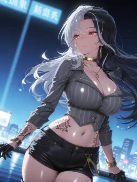 -rosannadefault,红眼睛,白发,黑发,双色发,多色发,长发,大乳房,金项圈,项链,毛皮大衣,乳沟,灰色衬衫,条纹衬衫,肚脐,腹部,纹身,黑色手套,半手套,手镯,珠宝,黑色短裤,黑色大腿靴