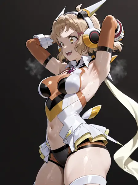 Prompts: 1girl, solo, short hair, brown hair, brown eyes scarf, headgear, navel, headphones, bodysuit, medium breasts, gauntlets,, hair ornament