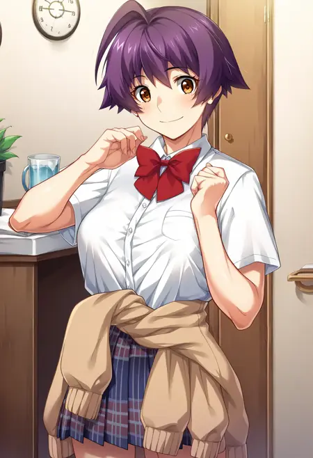score_9, score_8_up, score_7_up, score_6_up, score_5_up, score_4_up, masterpiece, source_anime, 1girl, c-marina, short hair, purple hair, brown eyes, collared shirt, red bowtie, short sleeves, plaid skirt, clothes around waist, looking at viewer, indoors, depth of field, shiny hair, shiny skin,