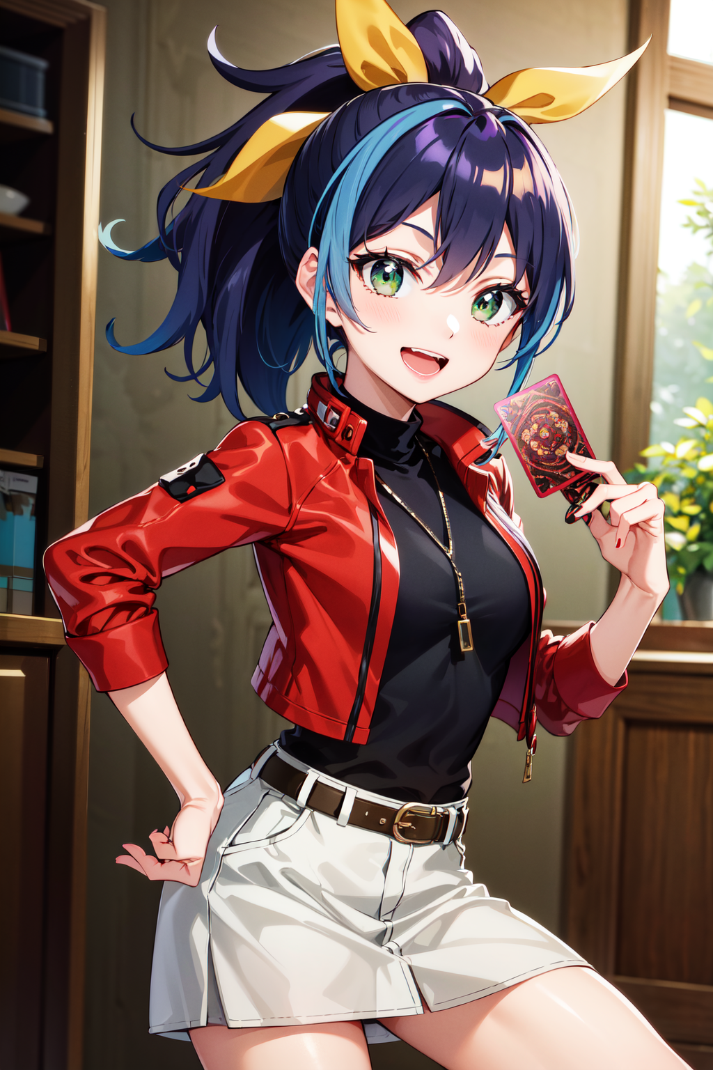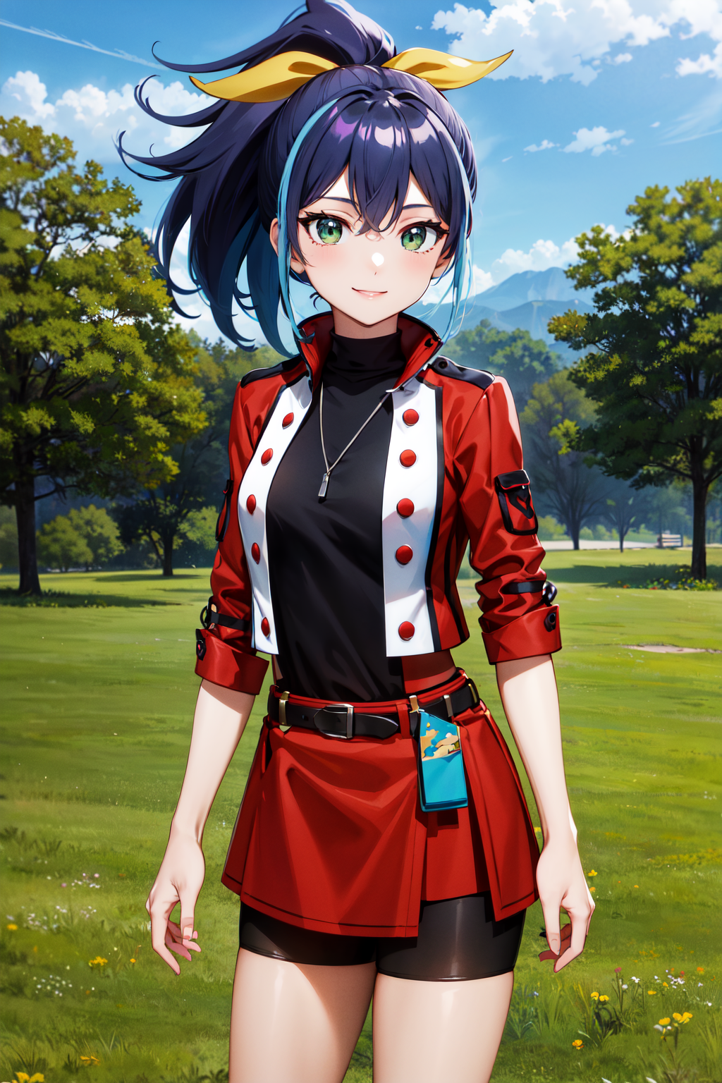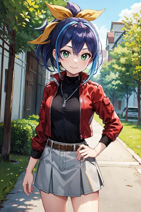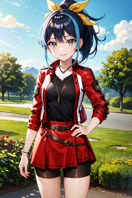 aaserena, ponytail, multicolored hair, black shirt, jacket, belt, red skirt, shorts under skirt