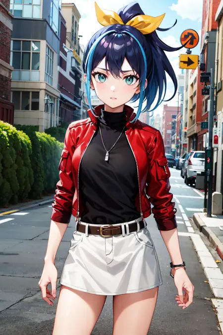 aaserena, ponytail, multicolored hair, red jacket, black shirt, belt, white skirt
