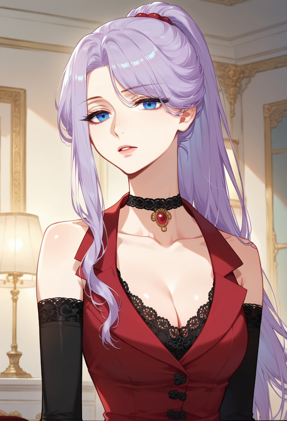 collarbone, choker, black sleeves, red dress, elbow gloves, cleavage, red vest,
