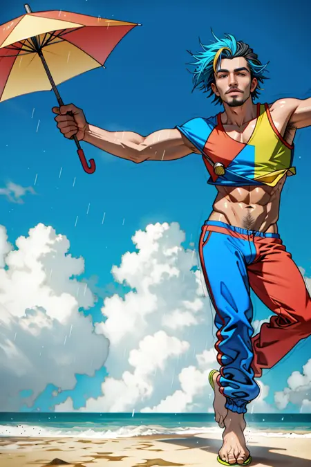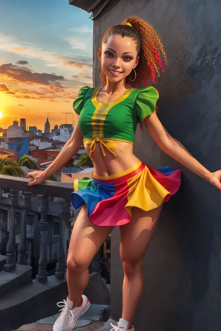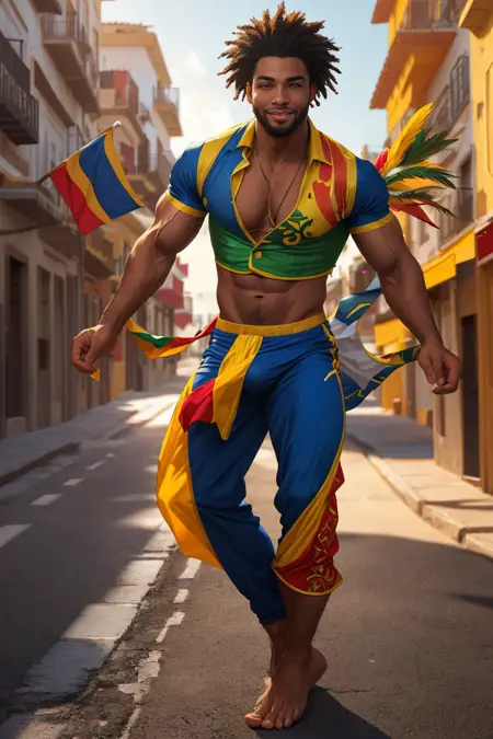 A traditional frevo dancer costume is very colorful, reflecting the energetic and lively spirit of the dance itself. The female costume usually features a short, frilly skirt, a tight blouse, and sometimes a small hat or headpiece, again, in bright colors. The male costume often consists of baggy pants, a loose, short-sleeved shirt, and sometimes a hat - all in vibrant colors. The costumes may also include shiny details or sequins to add more flare.