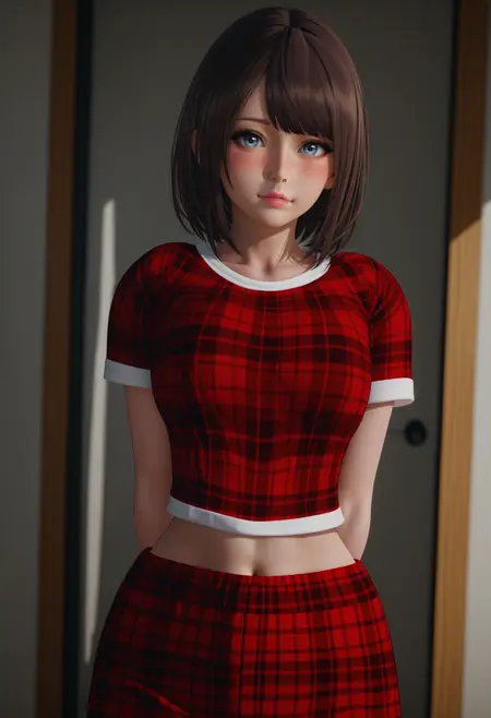 빨간 체크 자켓 "복부 노출, 배꼽 노출, 체크 셔츠, 체크 바지, 빨간 체크, 짧은 소매, 앞머리, 짧은 머리"