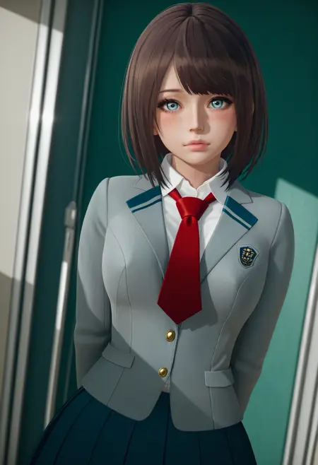 교복 "자켓, 짧은 머리, 교복, 빨간 넥타이, 주름치마, 흰 셔츠, 앞머리"