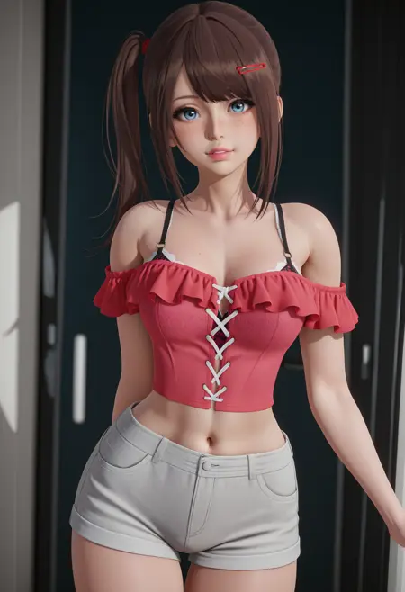 분홍 크롭탑 "배꼽, 복부 노출, 긴 머리, 어깨 노출, 오프숄더, 분홍 크롭탑, 회색 반바지, 빨강 머리클립, 브라 스트랩, 사이드 페인트, 앞머리"