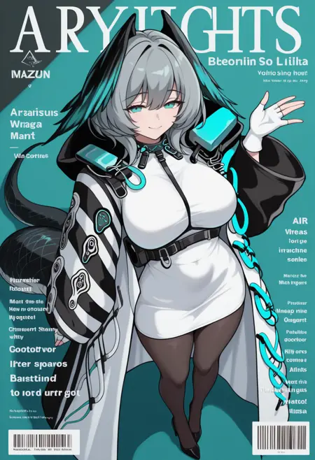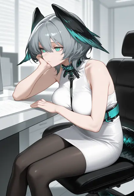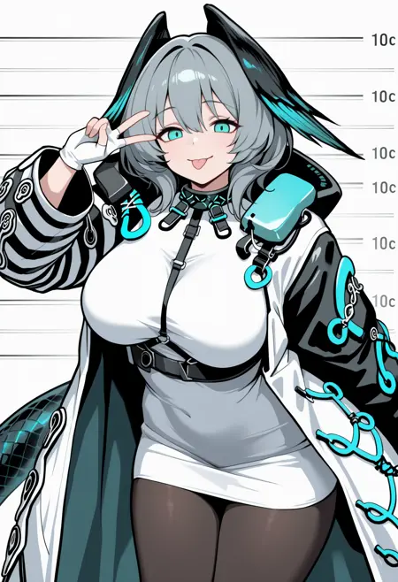 デフォルトの服装: hlykdef, snake tail, long tail, short hair, grey hair, hair between eyes, head wings, feathered wings, aqua eyes, long coat, white coat, open coat, long sleeves, short dress, white dress, pencil dress, strap between breasts, white gloves, fingerless gloves, black pantyhose, infection monitor \(arknights\), large breasts
