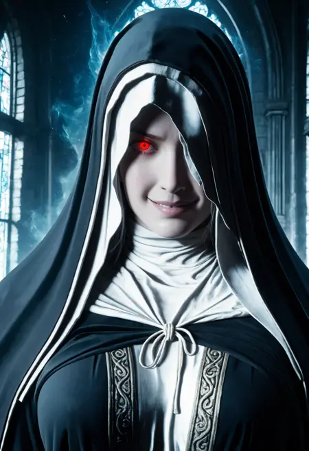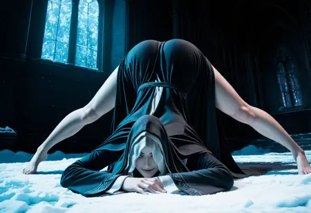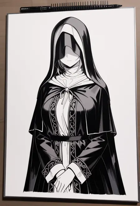 • 외모 태그: 눈 가린 상태, 수도원복, 수녀, 검은 코프, 후드 입음, 검은 베일, 검은 드레스, 긴 소매, 검은 후드 겉옷, 맨발