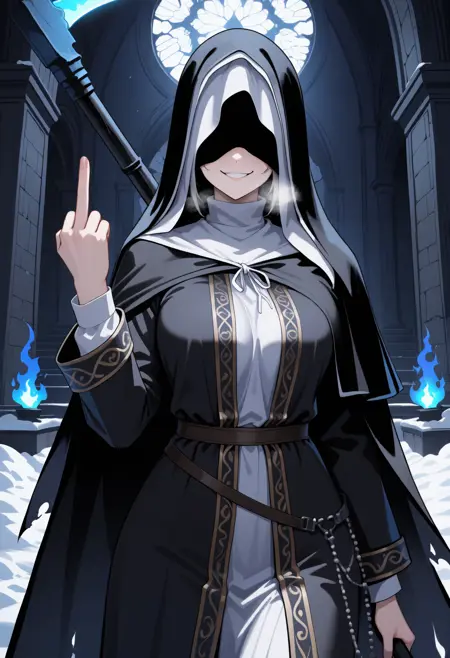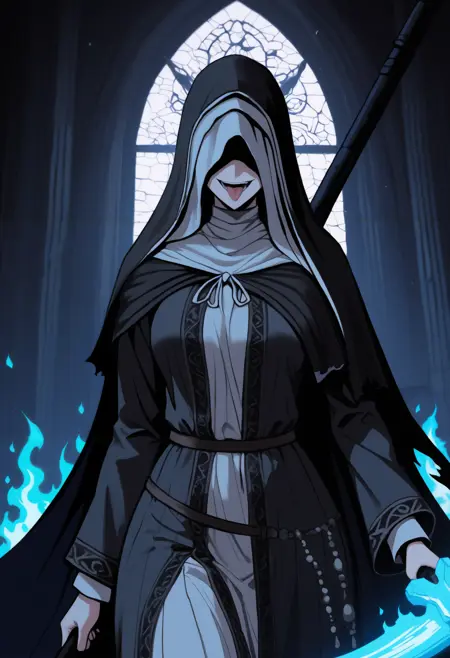 Looks tags: covered eyes, habit, nun, black coif, hood up, black veil, black dress, long sleeves, black hooded cloak, barefoot
