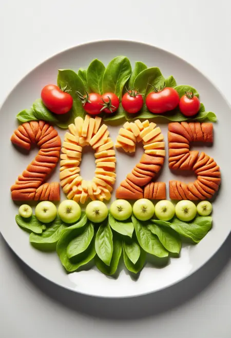 一张精心摆盘的食物艺术照片,设计成 (主题) 的形状。