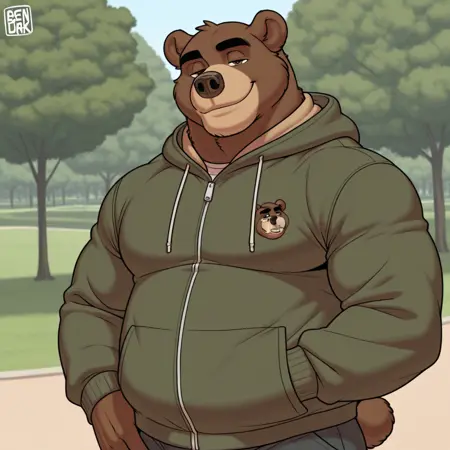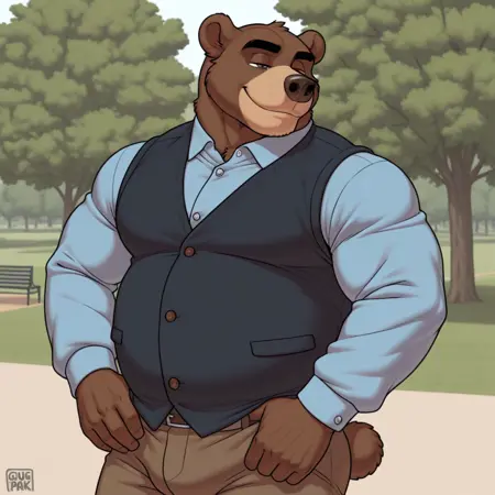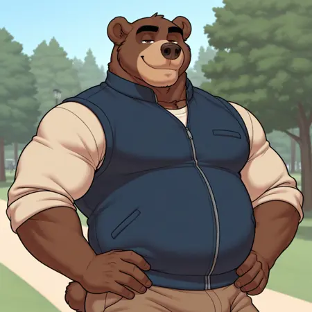 furry, male, brown bear, brown eyes, musclegut, nipples, pecs, bear tail, thick eyebrows,
