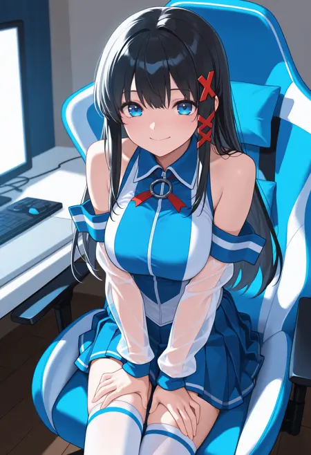 기본 복장: 투톤 셔츠, 파란 셔츠, 흰 셔츠, 칼라 셔츠, 목 끈, 분리형 소매, 투명 소매, 파란 치마, 주름 치마, 흰 허벅지 양말, 어깨 노출