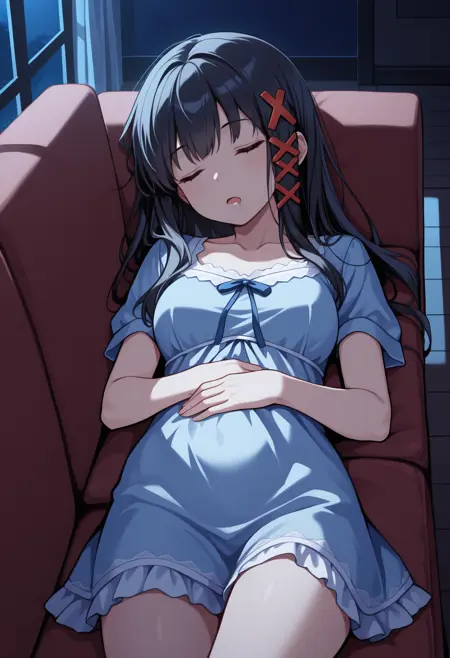 외모: 긴 머리, 검은 머리, x 머리 장식, 끈 리본, 파란 눈