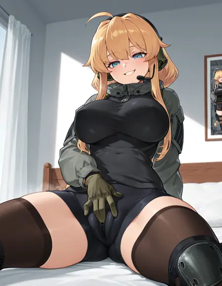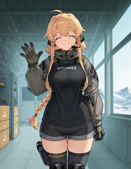 Whiskey Project, blonde hair, long braided hair, ponytail, ahoge, blue eyes, mole under eye, tactical clothes, load bearing vest, bulletproof vest, shorts, long sleeves, thighhighs, knee pads, headset, gloves