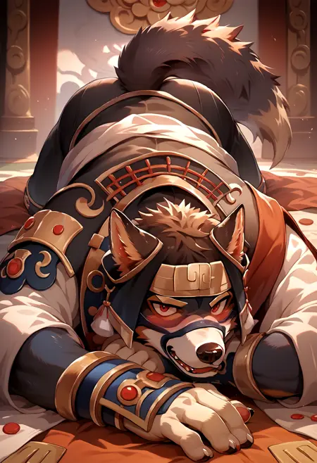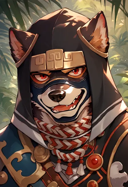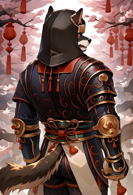 Hanzo, red eyes, dog boy, furry male, dog ears, hood, armor, japanese clothes, dog tail, japanese armor,