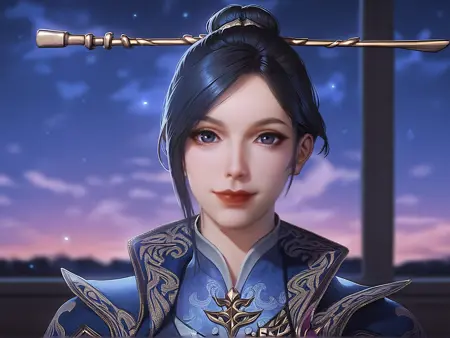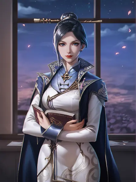 - 의상: high collar, chinese clothes, blue cape, white pants