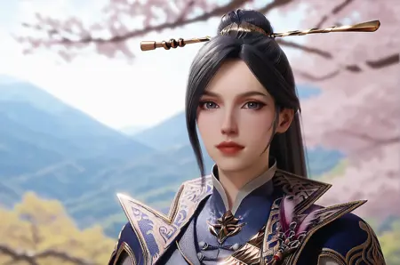 - 服装: high collar,chinese clothes,blue cape,white pants