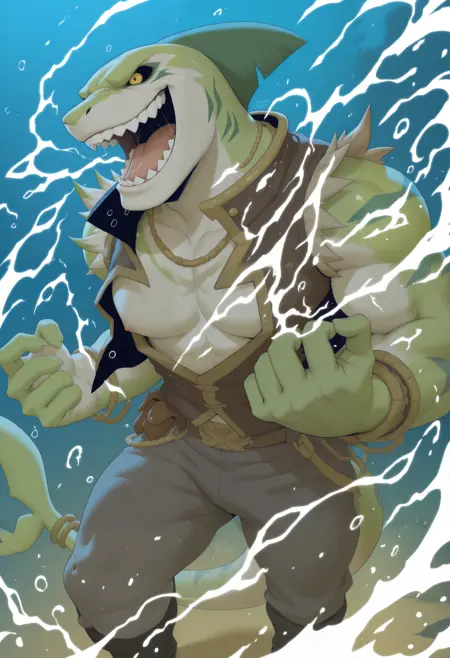 g4r0ld, shark boy,black boots, brown vest, grey pants,
