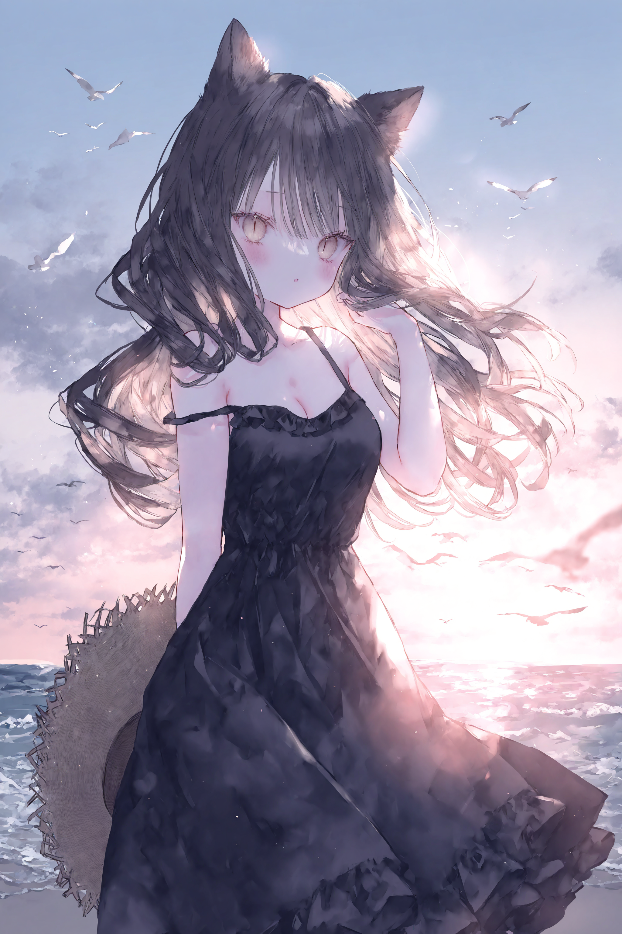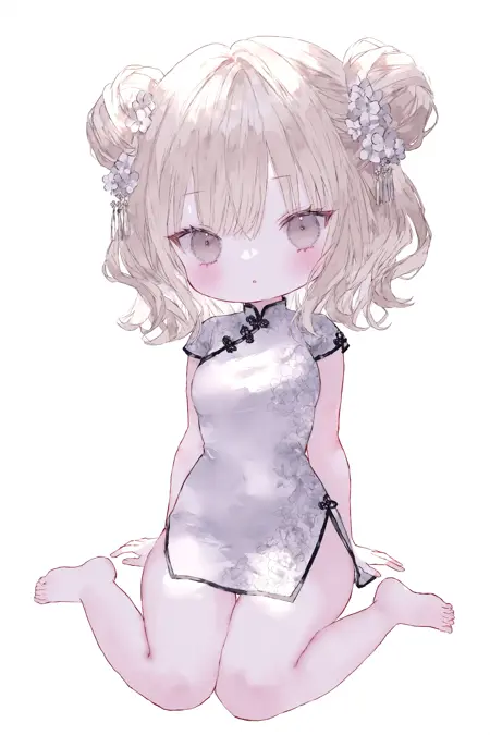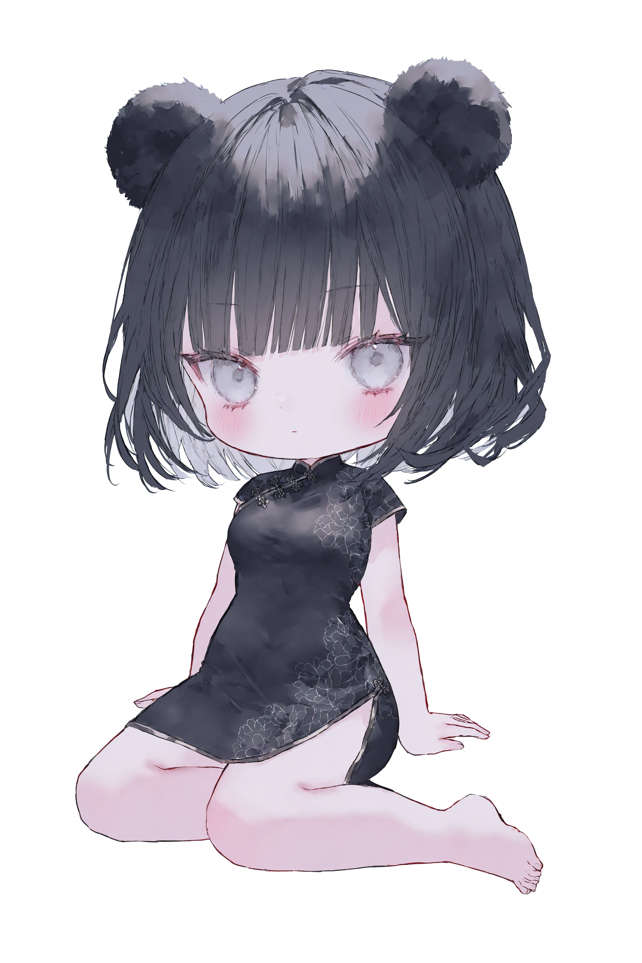 positive_prompts = "(masterpiece, extremely aesthetic, best quality, amazing quality), newest, highres, absurdres, onineko, sitting, yokozuwari, arm support, depth of field, looking at viewer, 1girl, short hair, grey hair, panda ears, hair between eyes, grey eyes, light blush, expressionless, closed mouth, china dress, black dress, medium breasts, bare arms, hand on own thigh, barefoot, nature, on grass, flower, butterfly, dappled sunlight, blurry background"