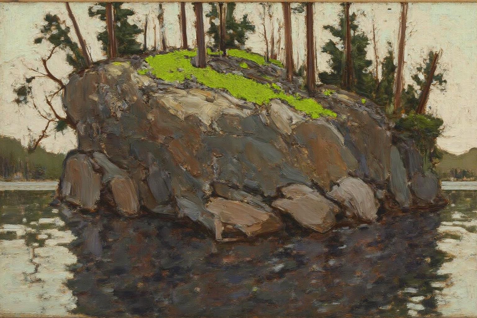 - もう一つの傑作で、カナダの荒々しい自然の象徴である単独のパインの木を描いている。