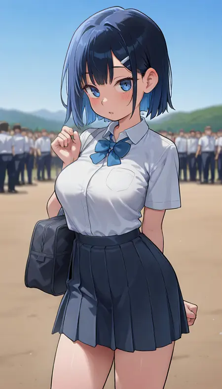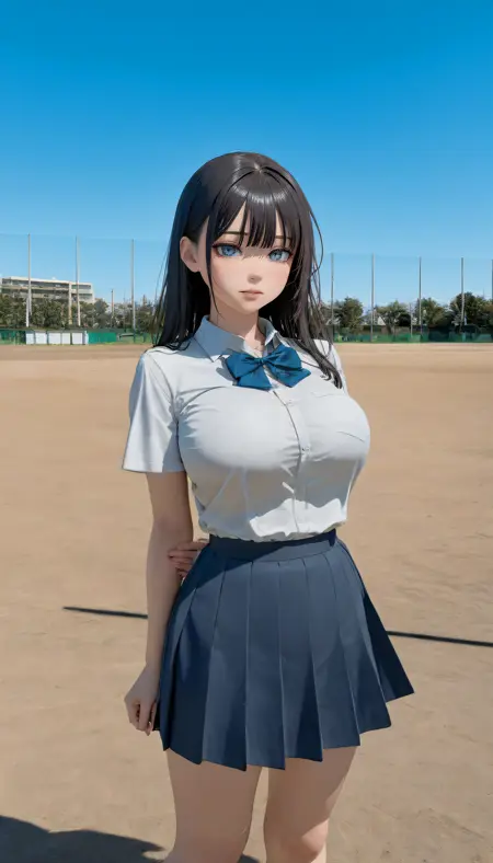 推荐:操场、学校操场、户外、山脉、围栏、建筑、学校、城市、树木、蓝天、1个女孩,