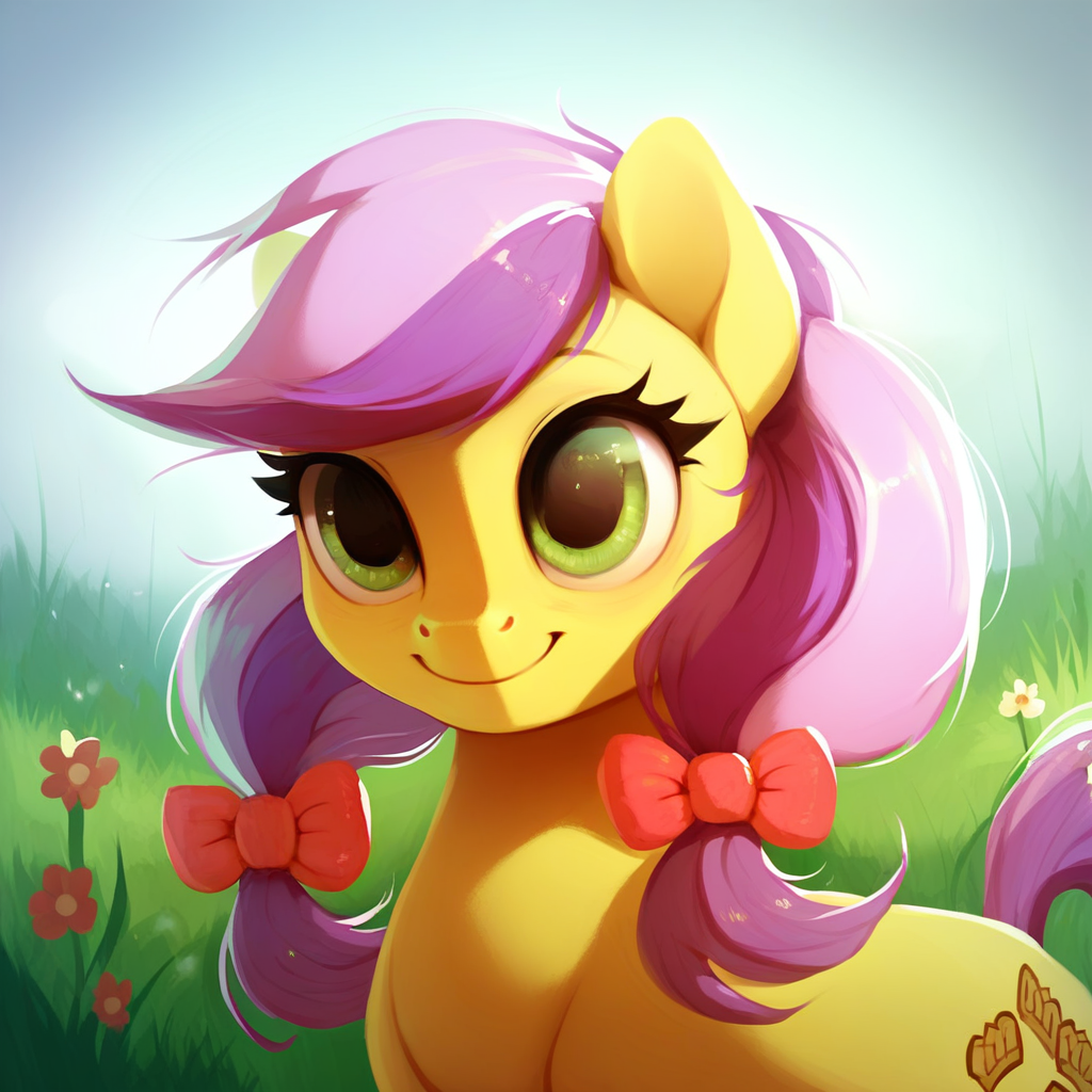 Lavender Fritter_(Mlp), Pony, Twintails, Low Twintails, Purple Hair, Red Bow, Green Eyes, Yellow Body