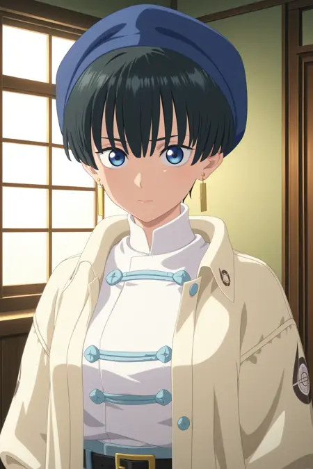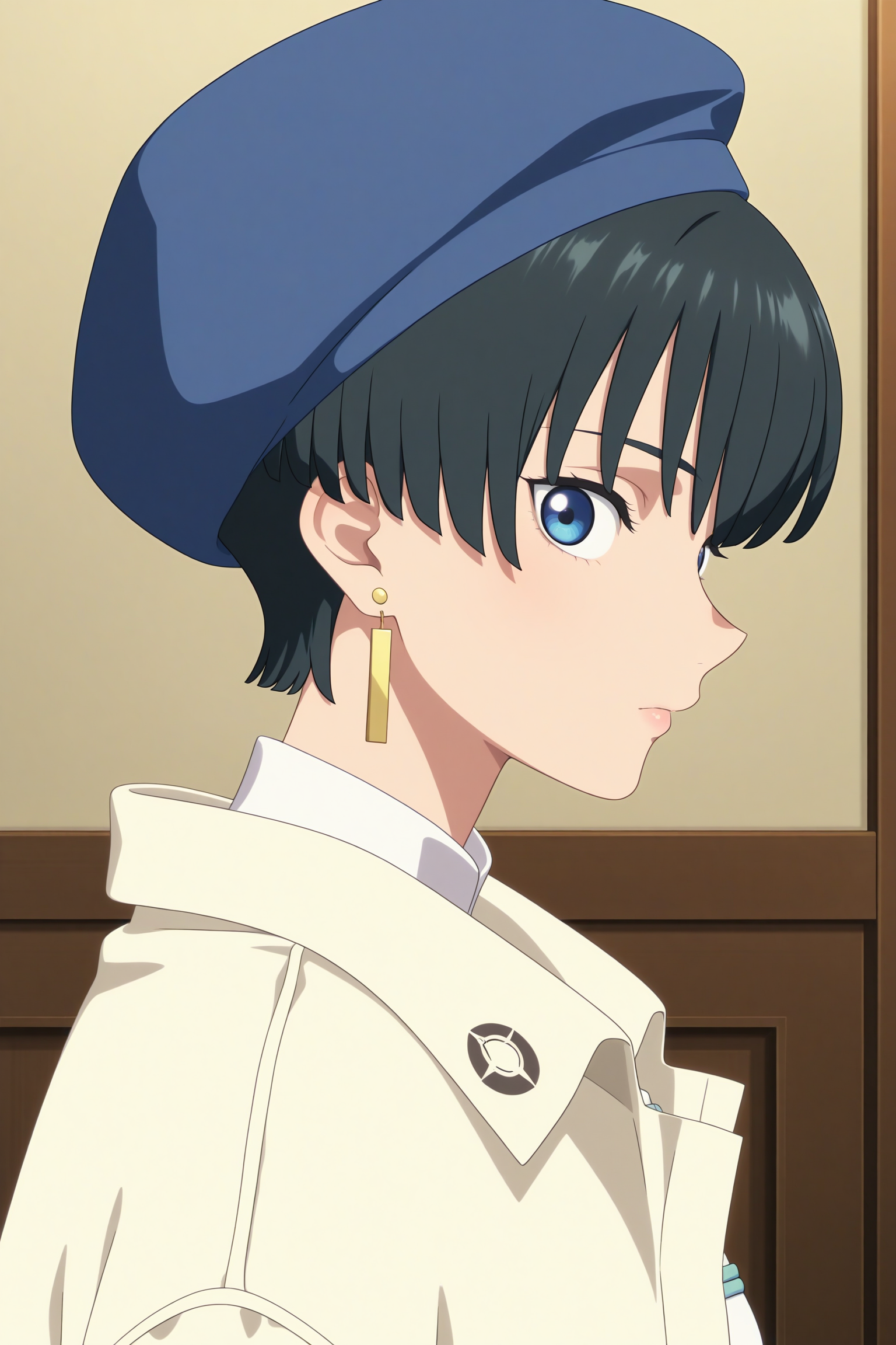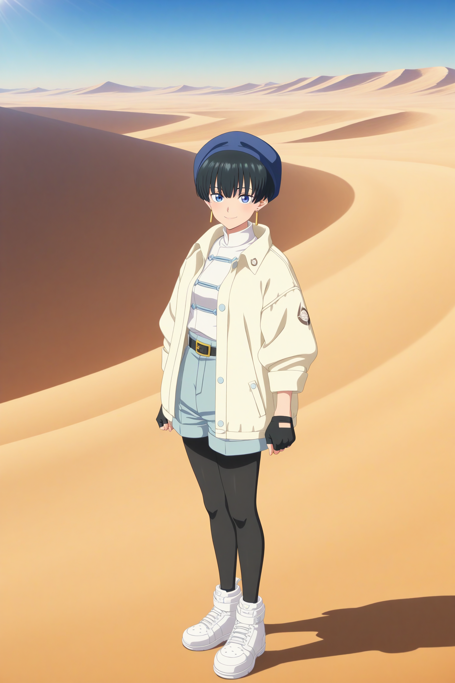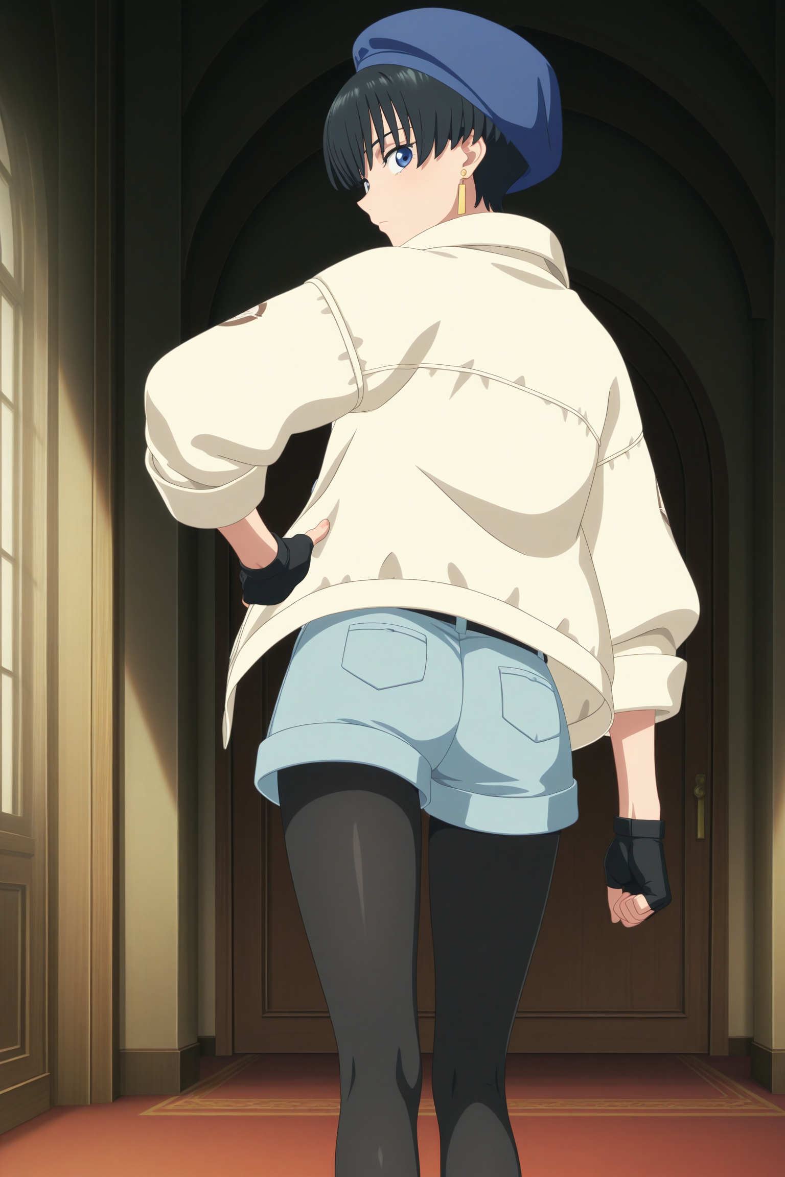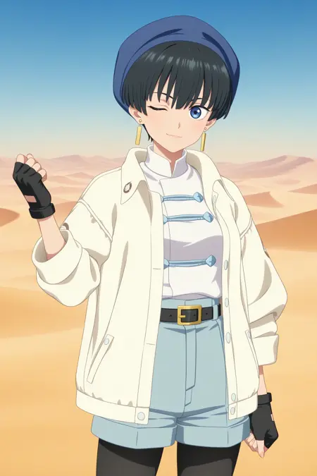 meryl stryfe, short hair, black hair, blue hat, beret, blue eyes, earrings, yellow jacket, open jacket, white shirt, black gloves, fingerless gloves, belt, blue shorts, black pantyhose, white footwear, sneakers