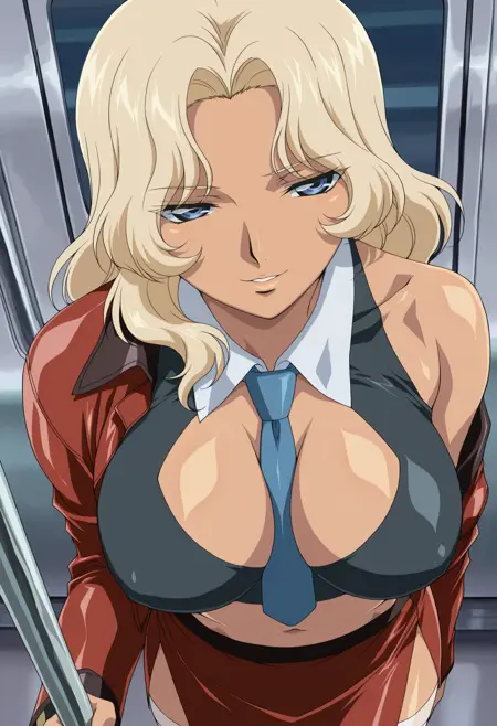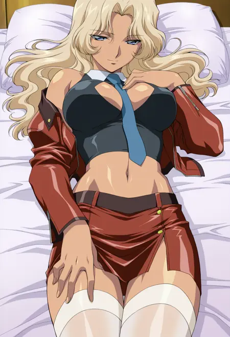 ベース:mieko_i、1girl、アニメ色調、シングル、長い髪、金色の髪、波状の髪、分け目のある前髪、青い目、カーポップ、青いネクタイ、胸の間のネクタイ、赤いジャケット、開いたジャケット、お腹部分、服の切り取り、片方の裸の肩、濃い肌、濃い肌の女性、鉛筆スカート、ミニスカート、赤いスカート、へそ、大きな胸、