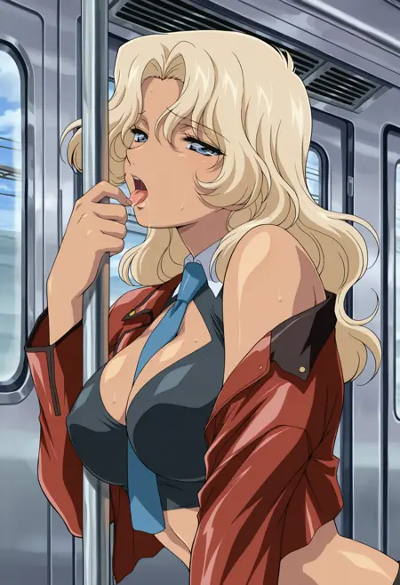 Base: mieko_i, 1girl, anime coloring, solo, long hair, blonde hair, wavy hair, parted bangs, blue eyes, crop top, blue necktie, necktie between breasts, red jacket, open jacket, midriff, clothing cutout, single bare shoulder, dark skin, dark-skinned female, pencil skirt, miniskirt, red skirt, navel, large breasts,
