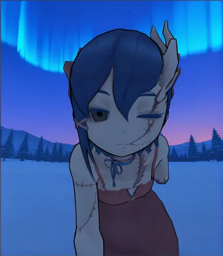 短い髪、前髪、髪の飾り、リボン、目の間の髪、閉じた口、青い髪、片目を閉じている、角、黒い目、人間なし、傷跡