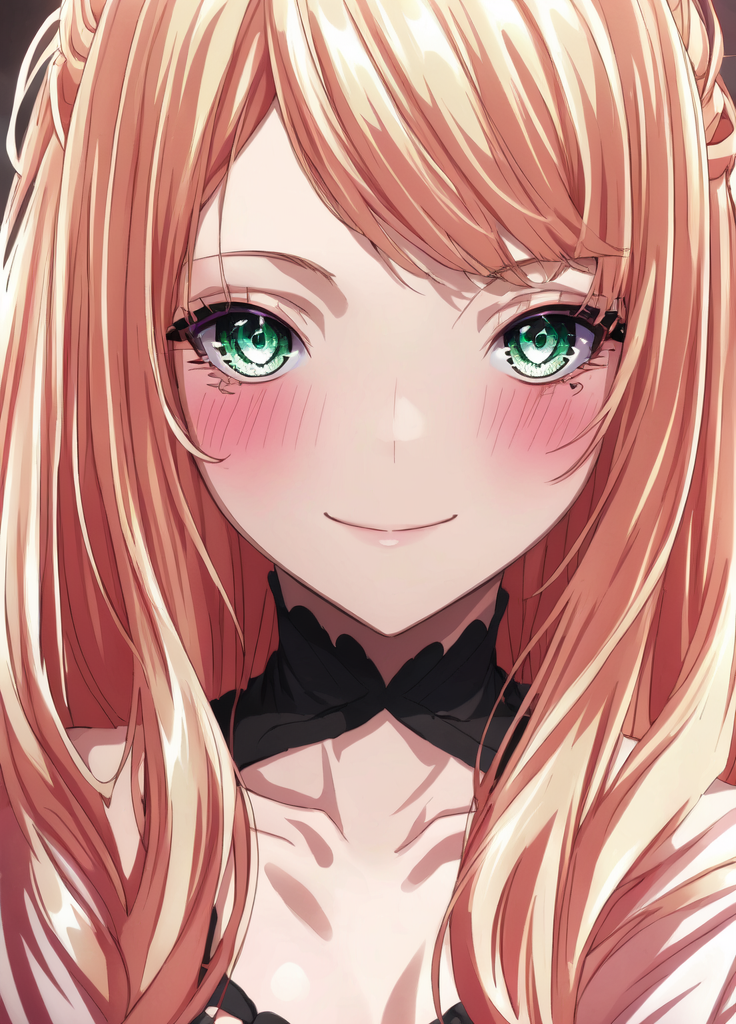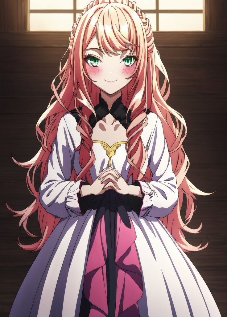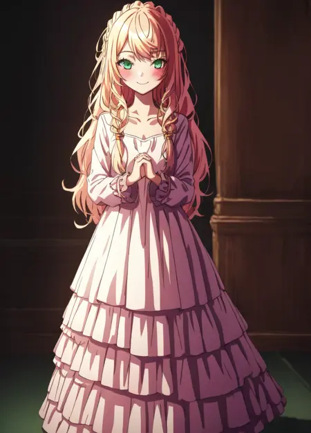 基础提示:莱克西亚,1个女孩,金色头发,脸红,辫子,紧握的手,锁骨,裙子,细致的眼睛,绿色眼睛,室内,长发,长袖,看向观众,紫色裙子,微笑,单独,非常长的头发,