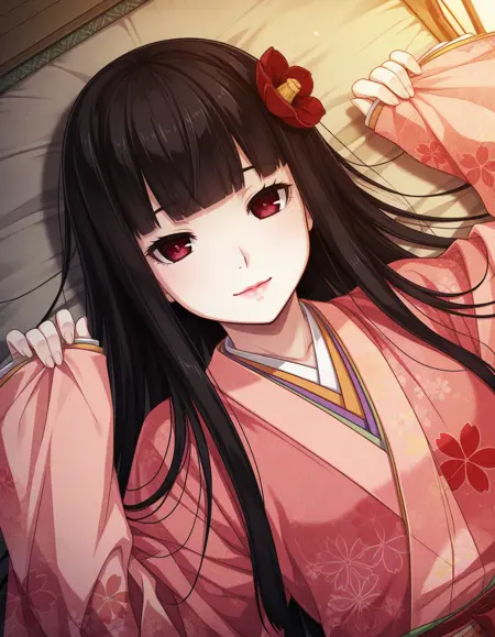 hime_Erewhon, 검은 머리카락, 매우 긴 머리카락, 머리카락 꽃, 둔한 앞머리, 빨간 눈, 입, 계층적인 키모노, 분홍 키모노, 일본 옷, 소매가 손목을 넘음