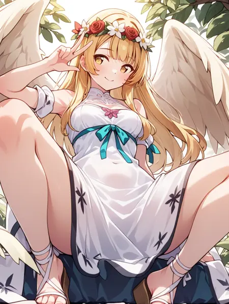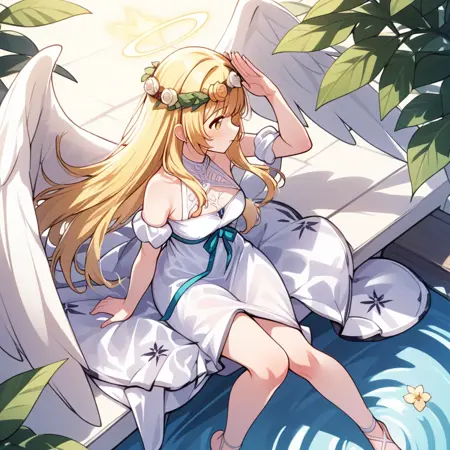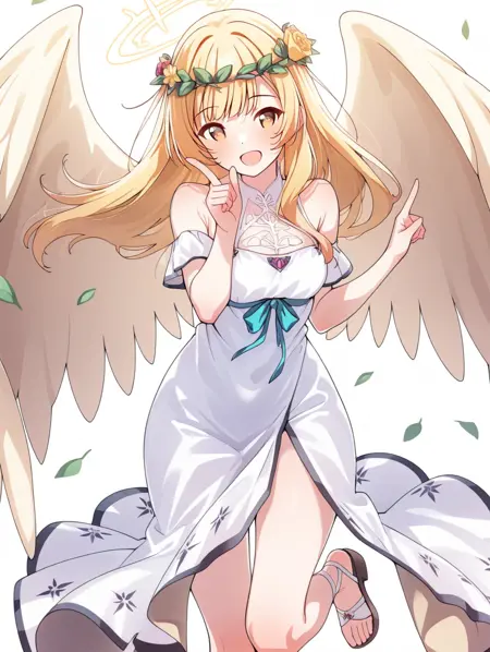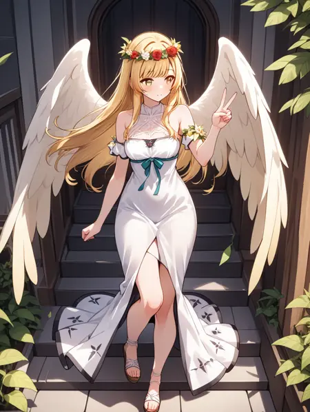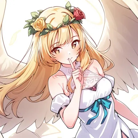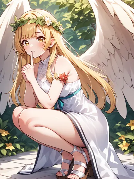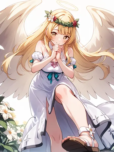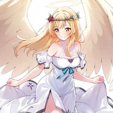 プロンプト例: erisu,頭輪,金髪,長い髪,黄色い目,白いドレス,肩出し,天使の翼,リボン,前スリット,サンダル,葉,花の腕輪,