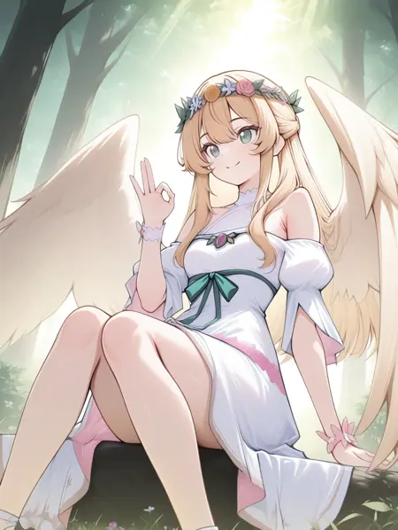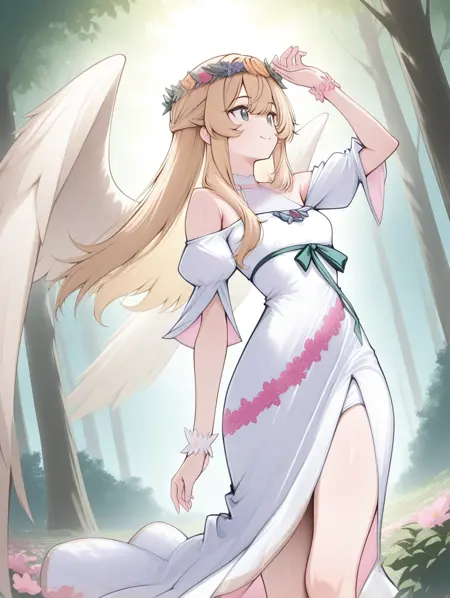 프롬프트 예시: erisu, 머리 화관, 금발, 긴 머리, 노란 눈, 흰 드레스, 어깨 노출, 천사 날개, 리본, 앞쪽 슬릿, 샌들, 잎, 꽃 팔찌,