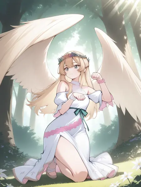 プロンプト例: erisu,頭輪,金髪,長い髪,黄色い目,白いドレス,肩出し,天使の翼,リボン,前面スリット,サンダル,葉,花の腕輪,